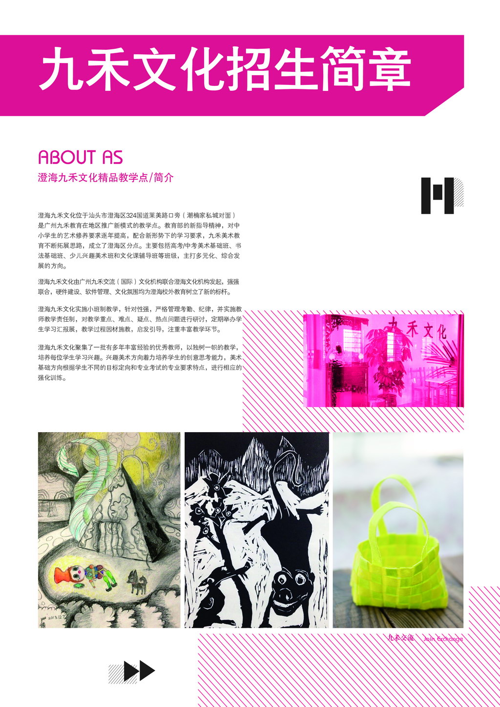 澄海九禾文化有高中/初中美术班班、插画班、特色版画班、动漫班、绘画涂鸦班、创意DIY班、文化补习班等班级!九禾美术教育微博:九禾教育-九禾交流;九禾教育微信平台:jiuhejiaoyu 九禾教育网址:www.jiuhejiaoliu.com 九禾文化邮箱:2756473351@qq.com QQ:2756473351 九禾文化招生热线:13923913138(王老师)/18023237779 (办公室) 九禾文化地址:汕头市澄海区国道324线(岭亭乡亭旁边)潮楠家私城正对面9-10楼九禾文化。