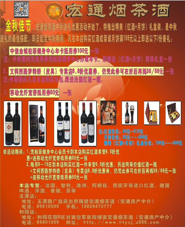 宏通红酒坊(和翔店)荣诚月饼上架了!即日起至中秋期间凡到本店购买红酒、月饼满198元以上送3份豪礼[礼物]【中信金城柏菲健身中心年卡抵用券100元】一张[礼物][移动光纤宽带抵用券50元]一张、[礼物]《文祠西路52号梦特娇(皮具)专卖店8.8折优惠券一张、仍凭此券可在折后再抵38/68元》礼盒二瓶红酒¥228元起、礼盒红酒配月饼¥168元起 欢迎光临惠顾