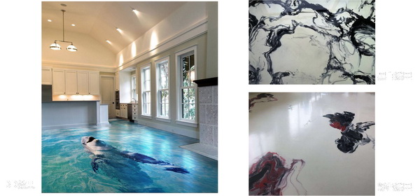 l 施工流程:清洁素地、喷洒渗透液、硅胶自流平、打磨、无溶剂底漆、贴3Dpc膜或请专业艺术画家设计图案、透明水晶漆面漆
