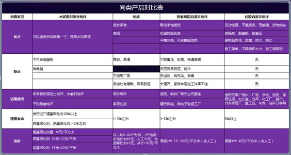 l 施工流程:清洁素地、喷洒渗透液、硅胶自流平、洒硅晶石材料、打磨、抛光上面漆