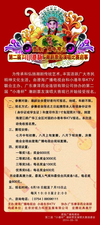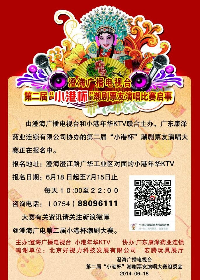 第二届“小港杯”潮剧票友演唱大赛最高人气奖微信投票开始啦!为让更多人观赏到本届进入决赛选手的精彩演唱,选出自己心中最喜爱的选手,大赛特设立最高人气奖,对12名进入决赛选手分A、B两组进行微信投票,票数最多的选手将获得大赛最高人气奖(1名 奖金800元),投票截止2014年8月22日23时。决赛将于2014年8月23日晚在澄城影剧院进行,届时澄海电视台将做现场直播,敬请观赏!A组选手:【欧阳群】【黄俊林】【陈瑞凤】【张天雄】【蔡铭君】【许冬生】B组选手:【蓝渲瑜】【黄瑞昌】【刘韩佳】【余琦琪】【高岱英】【金利好】为以上12名选手投票观看投票选手复赛视频请扫一扫二维码关注微信公众号:chshxx 主办单位:澄海广播电视台 小港年华KTV协办单位:广东康泽药业连锁有限公司鸣谢单位:北京好视力科技发展有限公司 宏腾玩具展厅 汕头市秦稼跆拳道文化有限公司