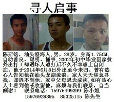 陈斯铭,男,现年28岁,身高1.75CM,汕头市澄海口音,自幼善良、聪明、懂事,初中毕业因家贫外出打工却遇坏人遭打后不久不幸患上自闭症。他于2014年6月8日外出至今未归。